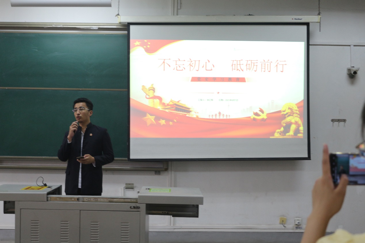 宣講現場,徐匯軻同學圍繞“不忘初心,砥礪前行”這一主題,從全面了解黨史、把握黨史學習重點和黨史發展的核心、了解習近平新時代中國特色社會主義思想幾方面,為全體參會人員講述了中國共產黨的歷史。徐匯軻同學在宣講中談到,作為青年學生,要從百年黨史中汲取智慧和力量,在黨史學習教育中厚植愛黨、愛國、愛社會主義的情感,堅定不移聽黨話、跟黨走,做到學史明理、學史增信、學史崇德、學史力行,爭做擔當民族復興大任的時代新人。