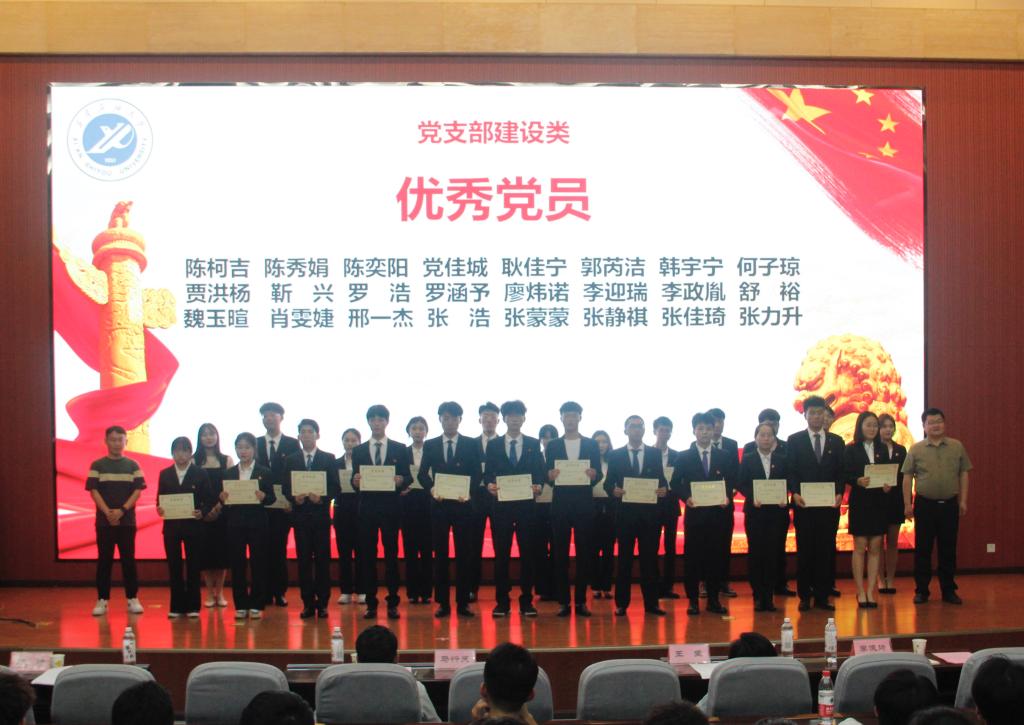 馬行天書記為先進黨支部頒獎。王瑩副書記為優秀黨支部書記頒獎。各年級輔導員老師共同為優秀黨員頒獎。