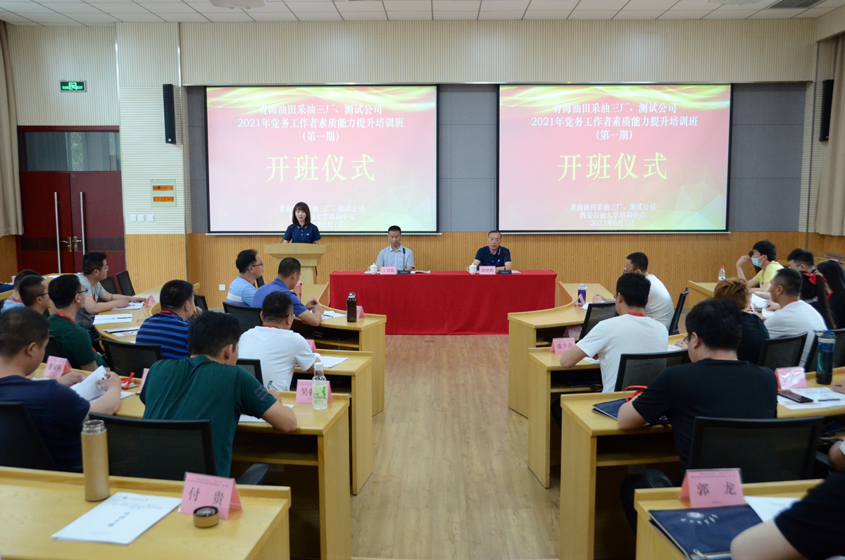 6月7日上午,“青海油田采油三廠、測試公司2021年黨務工作者素質能力提升培訓班(第一期)”在我校明德校區順利開班。來自兩家公司的50余位黨務工作者參加培訓。青海油田采油三廠紀委書記丁昌航、西安石油大學繼續教育學院院長談建勤參加開班儀式,儀式由班主任康高梅子主持。