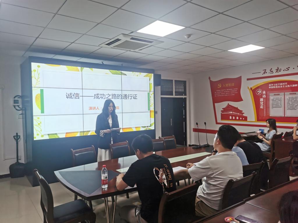 本次活動分為誠信主題演講、勵志成才報告、觀看反詐騙校園行安全教育短片三個環節。首先,各位研究生參賽選手參照“砥礪誠信品格 揚帆誠信人生”主題,結合自身經歷,旁征博引,引導大家牢固樹立誠信意識,恪守學術道德,堅守學術誠信,積極踐行誠實守信的道德觀念。