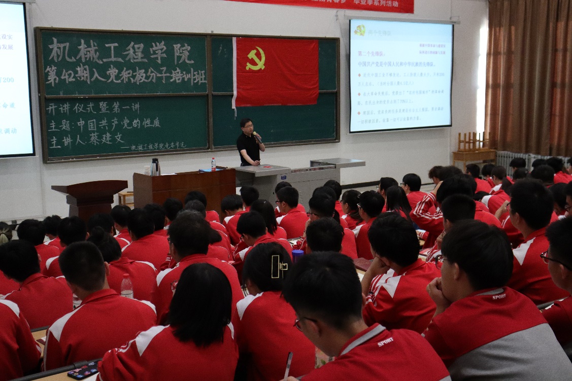為嚴肅黨的組織流程,提高入黨積極分子的政治覺悟,深化青年學生對黨的認識,根據黨員發展工作和黨史學習教育的統一安排,5月24日晚,機械工程學院在鄠邑校區天工樓115教室舉行第42期入黨積極分子培訓班開班儀式暨第一次集中授課。機械工程學院黨委書記蔡建文為全體入黨積極分子授課,主題為《中國共產黨的性質》,學院黨委副書記劉冰參加。開班儀式由2020級團總支書記馬舒宇主持。