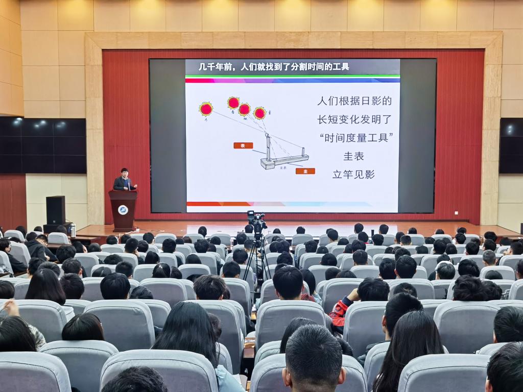 劉濤教授首先從時間的定義入手,對原子時、閏秒、時間的應用、生活中的時間等進行了通俗易懂的講解。他講到,時間精度的飛速提高,體現著人類探索自然、征服自然的強大力量和最高智慧。為了取得更精準的時間,目前世界各國都采用原子鐘組來產生和保持時間,通過電話、互聯網、衛星等各種手段將時間頻率信號送達用戶的整套服務系統,就稱為“授時系統”。接著,劉濤教授介紹了開展的研究工作。光纖時間頻率傳遞是目前最高的技術手段,他帶領團隊經過10年的攻關,突破了超高反射鍍膜、精密光學冷加工等關鍵技術,研制出國內首臺超高精細度光學參考腔,解決了超穩激光器核心部件的國產化,打破了美國技術壟斷;攻克多站點時間同步新技術,國內首次在千公里實地通信光纖上實現十皮秒級時間傳遞,建成了長距離通信光纖時間頻率傳遞試驗系統,保障了北斗導航測試評估系統和國家長短波授時系統的時間頻率溯源。最后,劉濤教授寄語莘莘學子,個人的發展與國家緊密相關,努力學習,掌握本領,才能報效祖國。