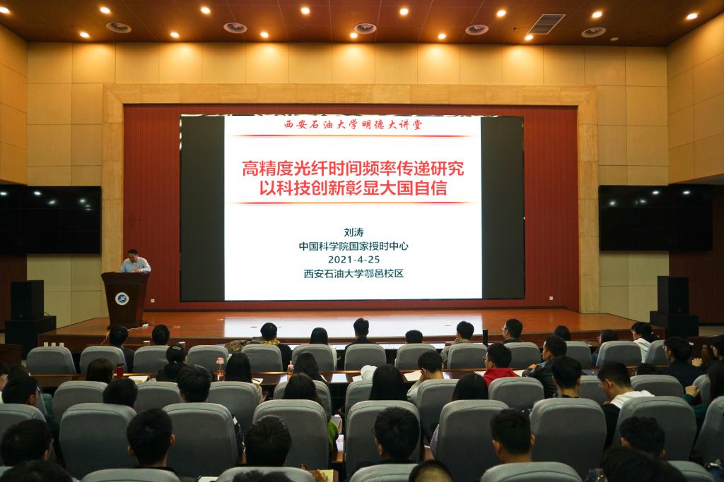 4月25日下午,由校團委和理學院主辦、理學院團委承辦的我校第七十期“明德大講堂”《高精度光纖時間頻率傳遞研究——以科技創新彰顯大國自信》在鄠邑校區圖書館弘石報告廳精彩開講。本期嘉賓是中國科學院國家授時中心二級研究員、中國科學院大學劉濤教授,理學院黨委副書記馬小剛主持報告會,全校400余名研究生和本科學生共同聆聽了精彩講座。