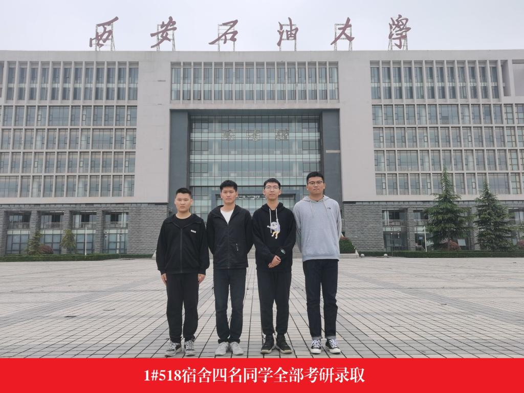 在諸多優秀學子中,1#518宿舍的四位同學全部被考研錄取,格外引人注目。該宿舍劉迎澳、劉峰同學被西安電子科技大學錄取,陳偉同學被華南師范大學錄取,萬希智同學被西安工業大學錄取,宿舍四人全員上岸,“學霸”宿舍,實至名歸。1#518的宿舍四名同學在日常學習中刻苦努力,積極參與學術競賽,多次獲得國家獎學金、品學兼優獎學金等榮譽。在考研期間互相監督,彼此鼓勵,每天晚上在宿舍分享今日備考遇到的問題或發現的知識漏洞。最終,一路相伴,“研”途圓夢。