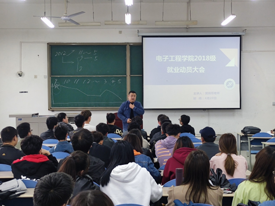為幫助學生更好地開展職業規劃,認清就業形勢,使學生們在就業道路上從容邁出第一步,4月20日下午,電子工程學院在鄠邑校區B102為2018級本科生召開了就業動員大會, 本次會議邀請了我校學生工作處副處長、就業指導中心副主任樊曉旭老師擔任主講嘉賓,會議由電子工程學院2018級輔導員錢宇航老師主持,學院2018級150余名學生參加了本次大會。