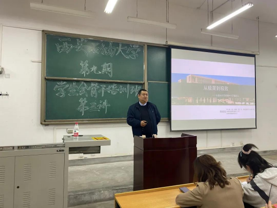 4月9日晚,我校第九期學生會骨干培訓班第三講在鄠邑校區教學樓B114教室舉辦,由學生處副處長樊曉旭老師主講。