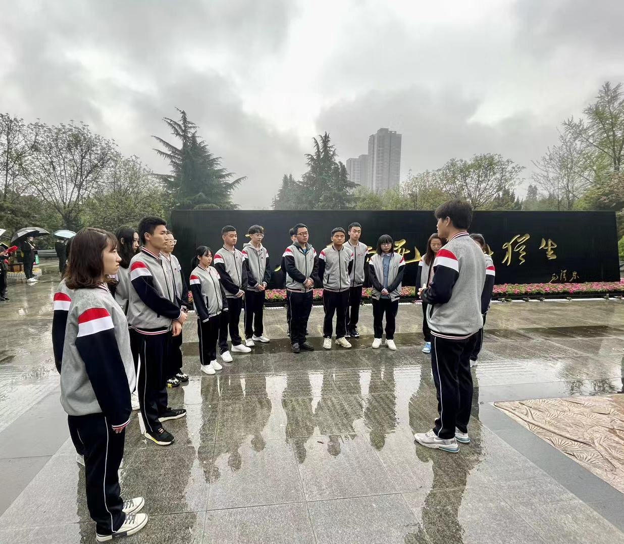 翠柏凝春,青松競秀,蒙蒙細雨中的烈士陵園更顯莊嚴肅穆。早八時許,在2018級輔導員張靚、2019級輔導員邱迪的帶領下,本次新發展的十六黨員代表齊聚在紀念碑前,共同學習黨史,緬懷革命英烈。
