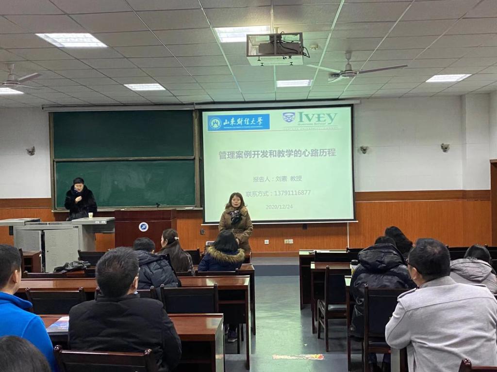 12月24日上午,山東財經大學工商管理學院教授、加拿大西安大略大學毅偉商學院兼職教授、魯商案例研發中心主任劉素教授在2號教學樓東階201教室作了題為《管理案例開發和教學的心路歷程》的學術報告。主管研究生教學工作的李俊亭副院長主持了報告會,王君萍院長和經濟管理學院專業碩士指導教師等近30人參加。