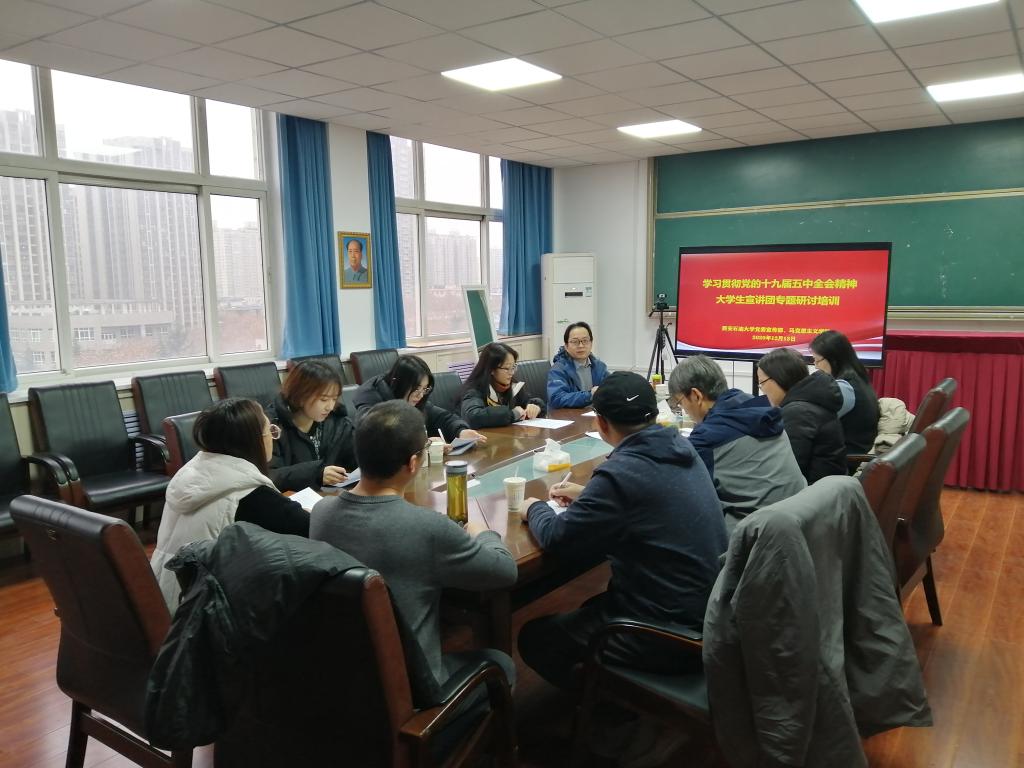 12月13日上午,馬克思主義學院舉辦了學習貫徹黨的十九屆五中全會精神大學生宣講團專題培訓會,會議采用騰訊會議線上線下相結合的方式在雁塔校區1#818、鄠邑校區經管人文樓325室同時召開。大學生宣講團全體成員和各小組指導教師參加了會議。本次會議由學院副院長肖發榮老師主持。