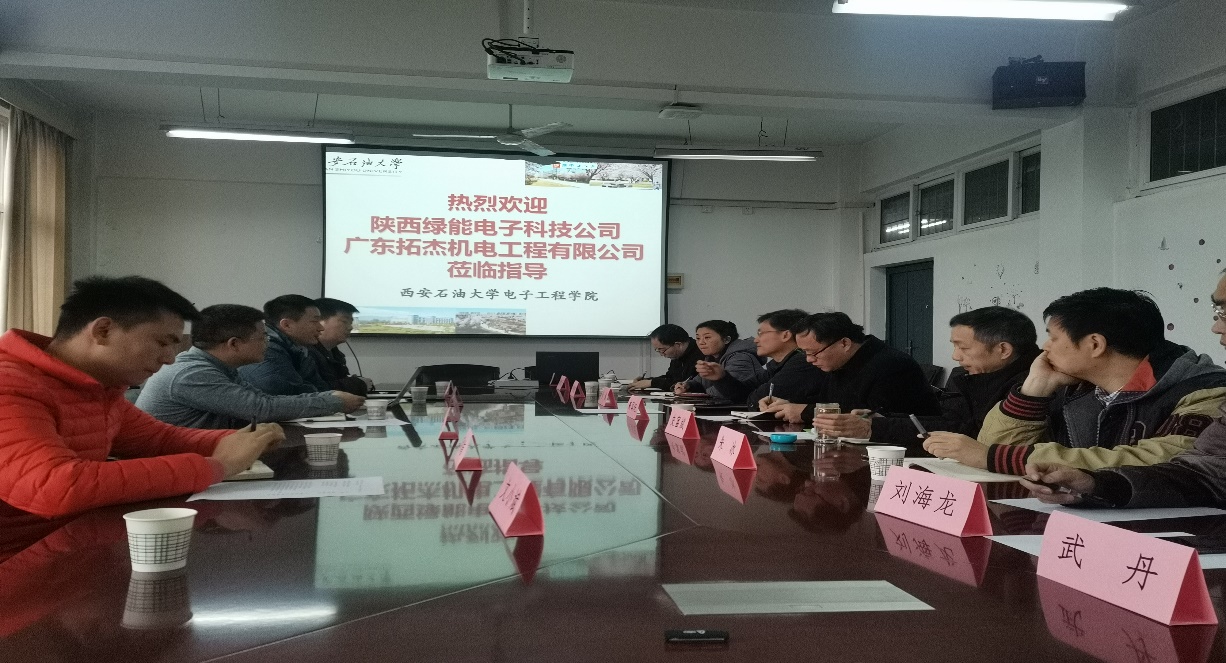 12月7日上午,廣東拓杰機電工程有限公司總經理潘志杰、陜西綠能電子科技有限公司總經理助理趙青、副總經理李貴虎等領導一行來我院開展技術交流與合作洽談,長慶工程設計有限公司電儀信工程設計部副主任李化龍高級工程師陪同來訪,交流會在1號教學樓905會議室舉行。學院黨委書記何鋮、副書記畢軼慧、副院長高國旺及自動化教、電氣工程及其自動化、安全工程等相關專業的教師參加了交流座談,學院副院長高國旺主持交流會。