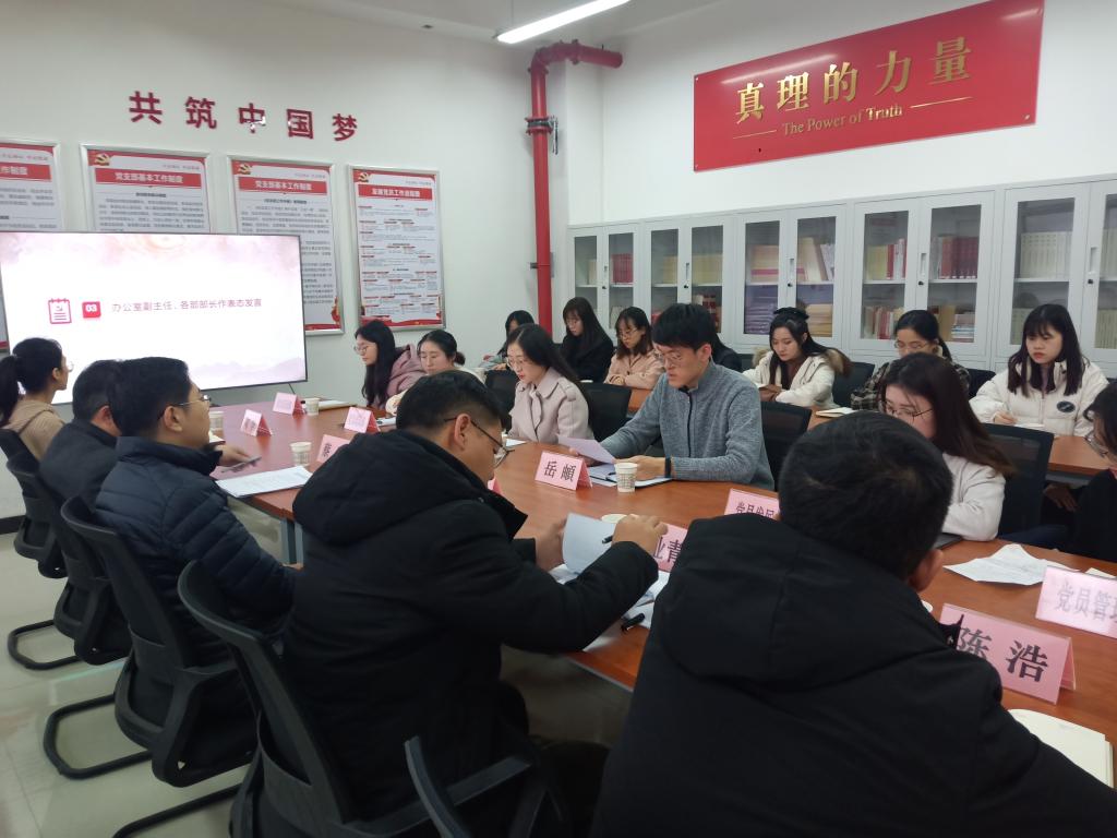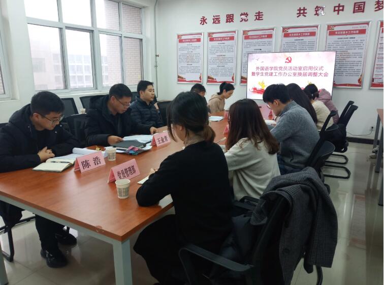 12月3日下午,外國語學院在經管人文樓學院黨員活動室430召開黨員活動室啟用儀式暨學生黨建工作辦公室換屆調整會議。校黨委組織部副部長王亮、學院黨委書記蔡強、副書記王業青、學院黨委專職組織員岳頔、輔導員陶李、陳浩和學生黨建工作辦公室全體學生干部參加會議。會議由學院黨委書記蔡強主持。