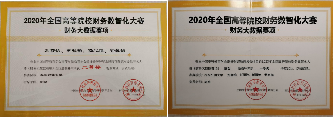 經濟管理學院會計(ACA)專業學生劉睿怡、尹弘韜、任思怡、郭馨怡組成的團隊,在吳勛老師的指導下,先是在由西安財經大學、西安電子科技大學協辦的陜西省賽階段,從省內30多所院校的50支參賽隊伍中脫穎而出,以第一名的成績獲得代表陜西省參加國賽資格。在全國總決賽階段,通過理論知識競賽、PPT方案呈現、PPT方案講解、現場答辯等多種比賽環節,利用網絡爬蟲、可視化分析、數據挖掘等大數據技術,展示了我院學生在數字商業環境中的財務大數據分析與應用能力,經過層層選拔,最終以優異成績獲得全國總決賽二等獎。