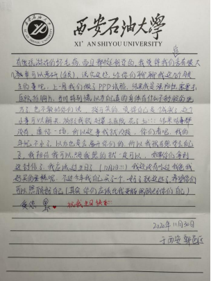 我院2020級輔導員李昱昊在總結活動時強調:社會在不斷發展,時代在不斷進步。越來越多的人通過語音視頻等方式向親人表達問候,但其實這種方式會有許多感恩的話語難以用語言表達,本次活動旨在于引導大家通過傳統的書信加深與父母及親友的情感溝通,懂得體會父母的不易,懂得父母的辛苦付出和默默承擔,培養大家的感恩意識、責任意識、獨立人格。