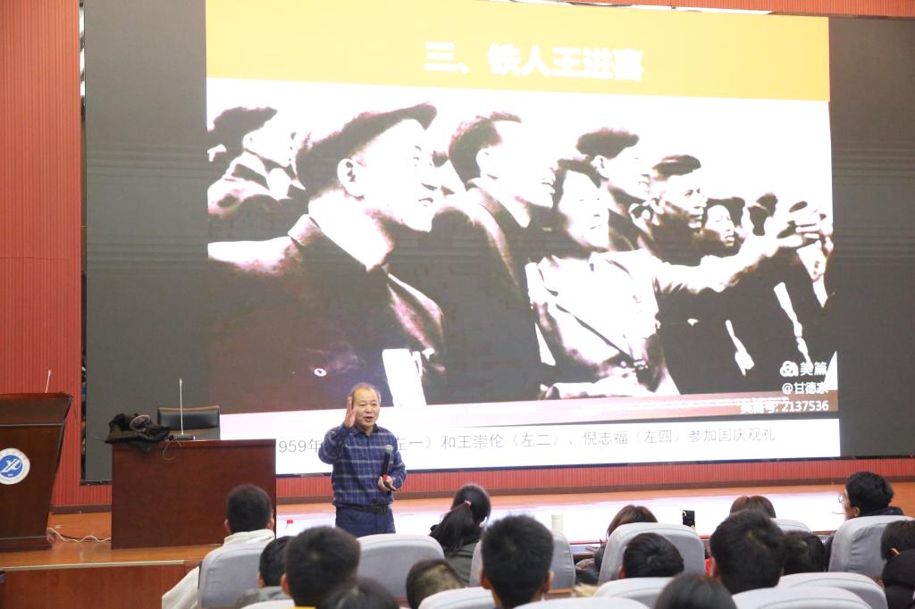 郭崗彥主任長期致力于大慶精神、鐵人精神的學習和研究,對鐵人王進喜的生平事跡和鐵人精神有著獨特的見解。此次報告會,郭主任從鐵人精神的歷史地位,鐵人精神產生的時代背景和鐵人精神帶給我們的啟示三個方面闡釋了鐵人精神的內涵。首先,郭主任通過對王進喜生平的講解以及他對中國石油工業發展的突出貢獻的描述,強調了王進喜民族英雄的歷史地位。隨后,郭主任回顧了上世紀六七十年代中國缺油少油的歷史背景,在中國石油極度匱乏的情況下,王進喜及所有參加大慶“石油大會戰”的全體石油工人用“人拉肩扛”“盆端桶提”的方式,為中國摘掉了“貧油”的帽子。最后,郭主任強調,作為當代大學生,應該學習王進喜“寧可少活二十年,拼命也要拿下大油田”的拼搏精神,堅定理想信念,明確學習目標,努力將自己培養成德智體美勞全面發展的社會主義建設者和接班人,為實現中華民族的偉大復興貢獻自己的力量。