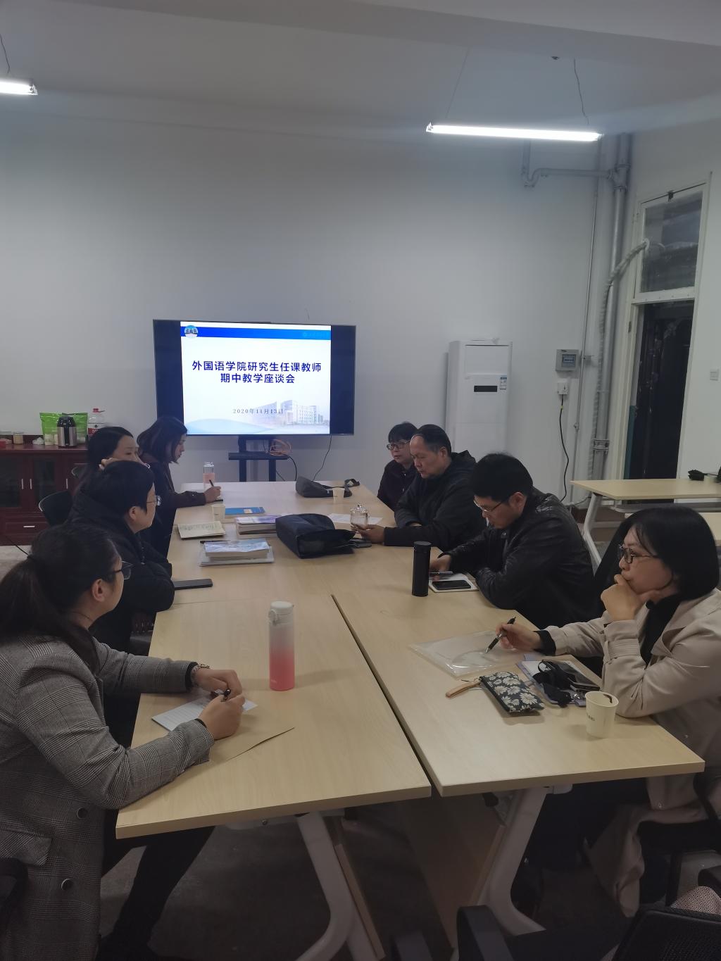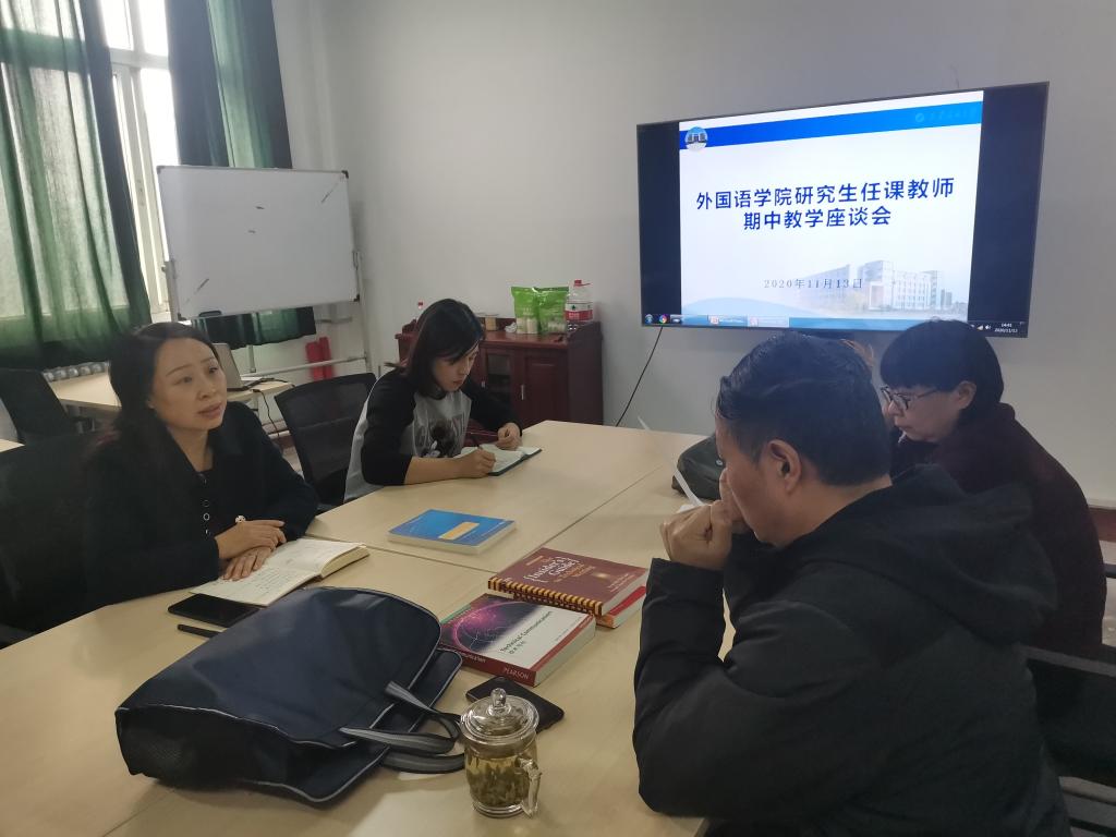 11月13日下午兩點半,外國語學院在雁塔校區1號教學樓727舉行研究生任課教師期中教學座談會。會議由劉輝副院長主持,院長于艷英、教授委員會主任袁森、翻譯碩士全體任課教師及研究生公外任課教師代表參加了此次會議。