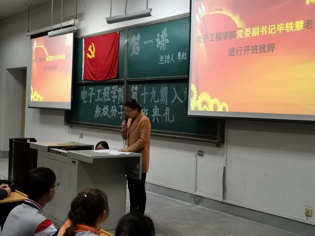 2020年11月10日晚19點整,中共西安石油大學電子工程學院委員會分黨校第十九期入黨積極分子培訓班開班典禮在鄠邑校區A234教室舉行,會議由電子工程學院組織員胡思文主持,黨政辦副主任、鄠邑校區管理辦公室主任覃彪、電子工程學院黨委副書記畢軼慧、學生管理辦公室主任周毅華、2019級輔導員沈軒羽、2020級輔導員李昱昊、帕麗丹以及學院本科生、研究生積極分子共計251人參加。