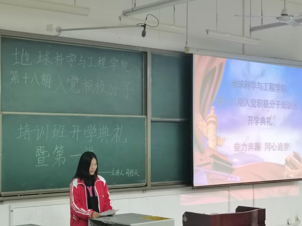 2020年11月4日晚,地球科學與工程學院黨校第十八期入黨積極分子培訓班暨第一講在鄠邑校區B121教室順利舉行。開學典禮由耿佳寧同學主持,地球科學與工程學院黨委書記馬行天老師、副書記孫會珠老師、團委書記邱嶺老師、黨委專職組織員張陽老師、2020級輔導員李佩琦老師以及192名入黨積極分子參加了開學典禮。