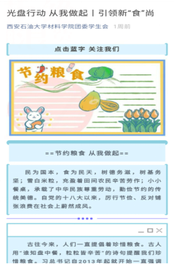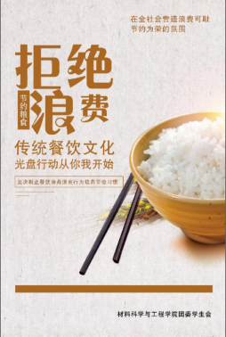 圍繞“拒絕餐飲浪費”主題,材料科學與工程學院在微信公眾平臺、QQ群等進行宣傳,并發出倡議。在全體學生中營造厲行節約、反對浪費、崇尚節儉的良好氛圍,樹立“一粥一飯當思來之不易,半絲半縷恒念物力維艱”的勤儉節約意識。