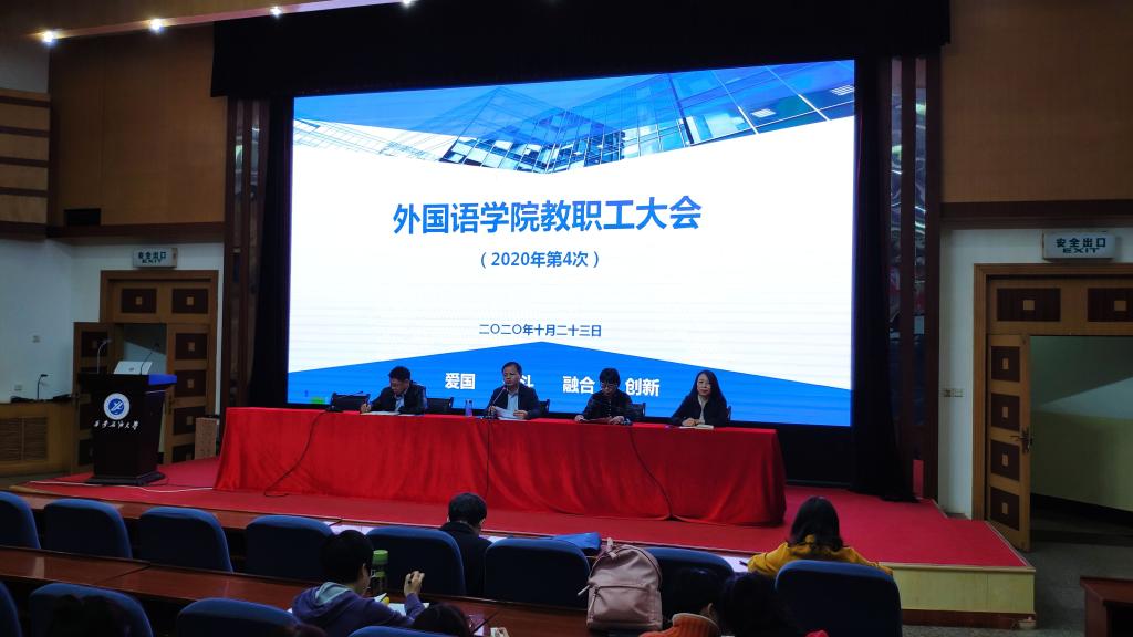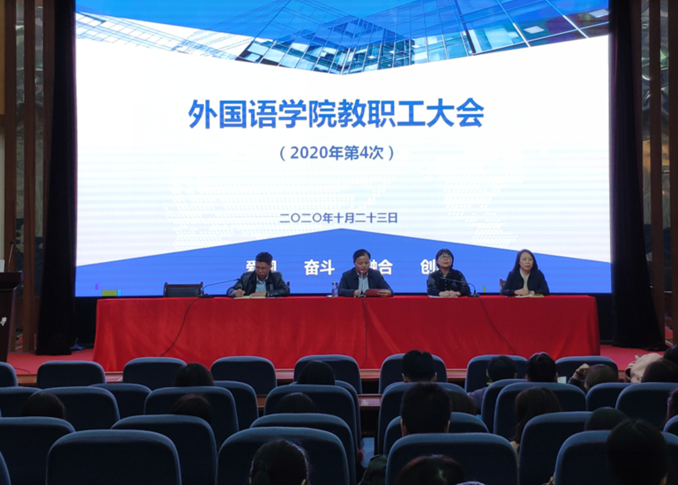 10月23日下午,外國語學院在雁塔校區學術報告廳召開全院教職工大會。全院教職工參加會議,會議由學院黨委書記蔡強主持。