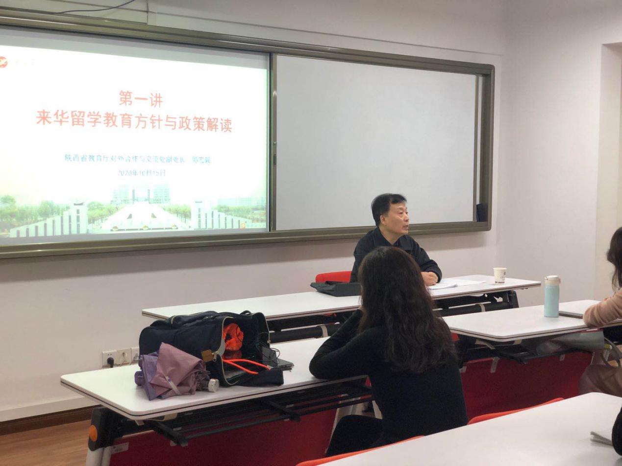 郭宏毅副處長以“來華留學教育方針與政策解讀”為題,從我國來華留學生發展過程及陜西省來華留學生發展現狀、陜西省來華留學生管理工作及取得的成績、留管干部工作建議及要求、今后來華留學生發展工作重點四個方面為主題,深入淺出,系統講解了來華留學生管理工作中的各項政策。此外,郭宏毅副處長結合實際案例,重點講解了突發事件處理、輿情管理、來華留學簽證審批表(JW202表)管理、如何實現提質增效等管理過程中的突出問題。