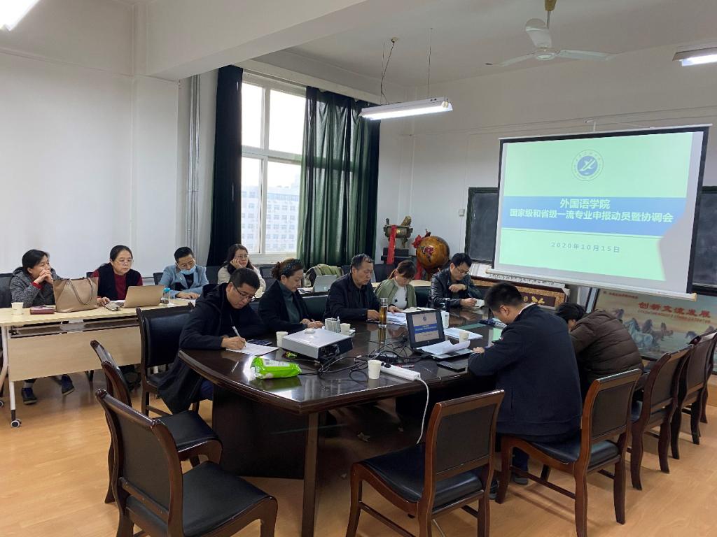 外國語學院于2020年10月15日下午2點30分在雁塔校區一號教學樓701會議室召開國家級和省級一流專業申報工作協調會。此次會議由陳武副院長主持,外國語學院院長于艷英,英語、俄語專業帶頭人、負責人,英語、俄語系正、副主任及部分教師參加了此次會議。