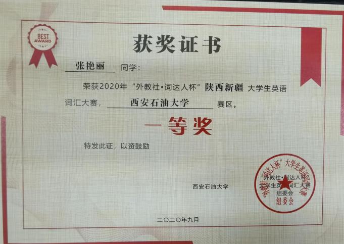 為更好地滿足高校大學英語網絡教學需求,提升大學英語智能化教學水平,豐富大學英語教學體系和內涵,促進英語學習、測試手段創新,提升大學生英語學習興趣和自學能力,上海外語教育出版社與陜西省大學外語教學研究會以及新疆自治區高校外語教學研究會聯合主辦2020年度“外教社·詞達人杯”陜西新疆高校大學生英語詞匯大賽。西安石油大學外國語學院于9月20日承辦了此次英語詞匯大賽。
