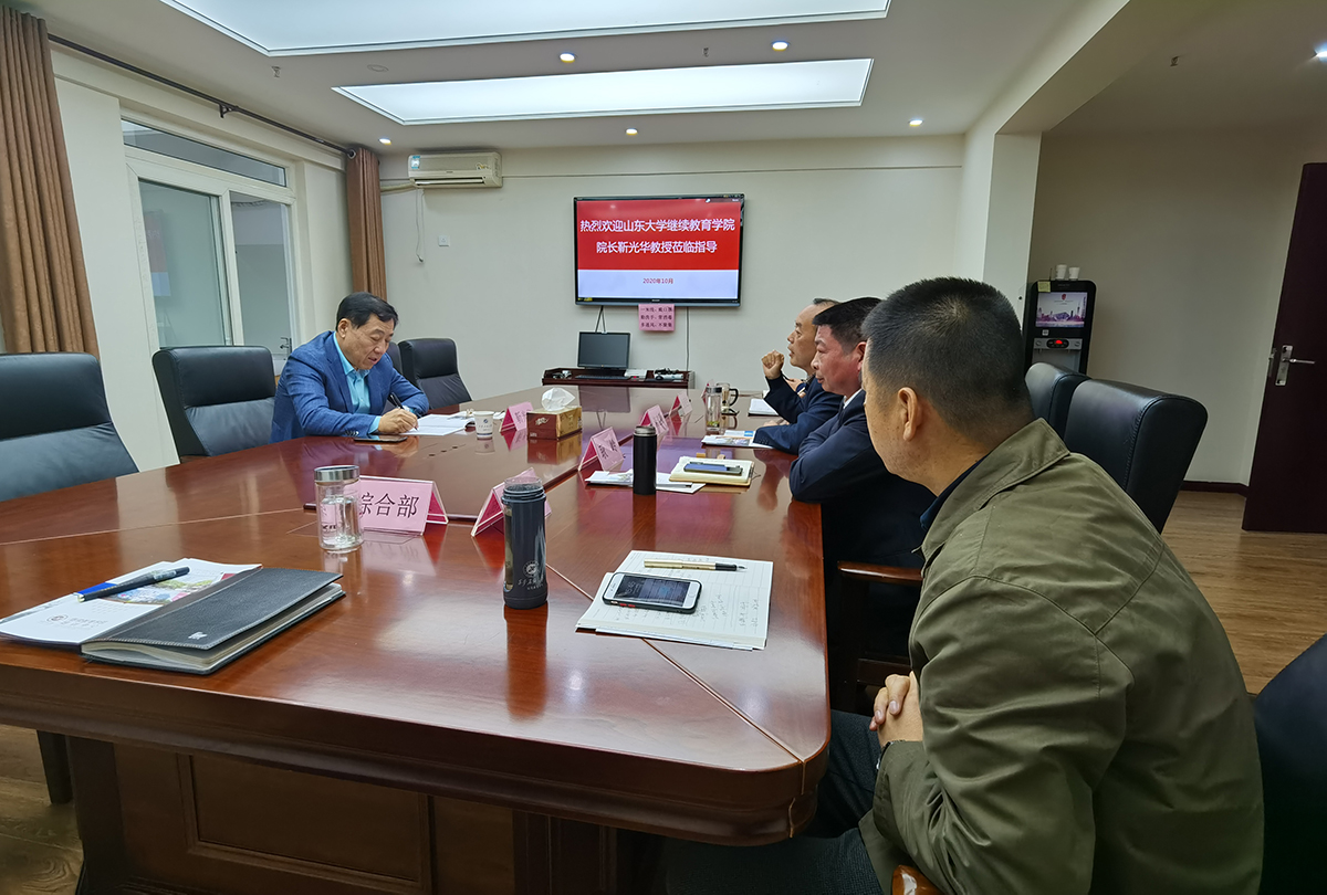 10月13日下午,山東大學繼續教育學院院長靳光華走訪我校繼續教育學院。繼續教育學院黨總支書記耿嶺主持座談會,院長談建勤,副院長吳民生,綜合部、學歷教育部、培訓部負責人參加了座談會。