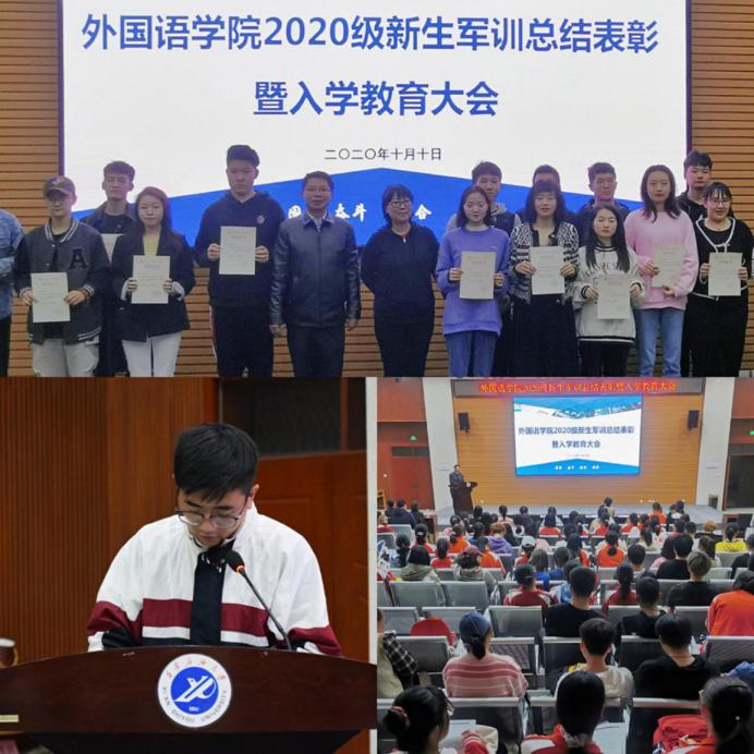 10月10日晚,外國語學院在院系樓118室召開了2020級新生軍訓總結表彰暨入學教育大會。院長于艷英、黨委副書記王業青、學工辦主任張帆、2020級輔導員陳浩以及學院團委學生會干部、2020級全體同學參加。會議由王業青副書記主持。