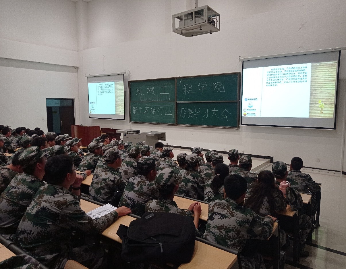 為貫徹落實學校三全育人精神,促使新生更好地了解石油行業發展,學習弘揚石油精神、鐵人精神,踐行學?!八膶嵰恍隆比瞬排囵B理念,盡快融入校園文化氛圍。按照學校軍訓科目的統一安排,9月25日晚,機械工程學院2020級新生石油行業形勢教育大會在鄠邑校區機械材料樓115室舉行。400多名新生參加本次大會,會議由2020級輔導員馬舒宇主持。