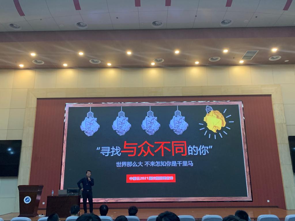 報告結束后,西安中服軟件有限公司運營總監呂蒙、普聯軟件股份有限公司西安分公司總經理劉宗慶從公司概況、企業文化、企業員工培養模式、企業目前的發展狀況及發展前景與同學們作了分享,并宣講了2020年企業校招。