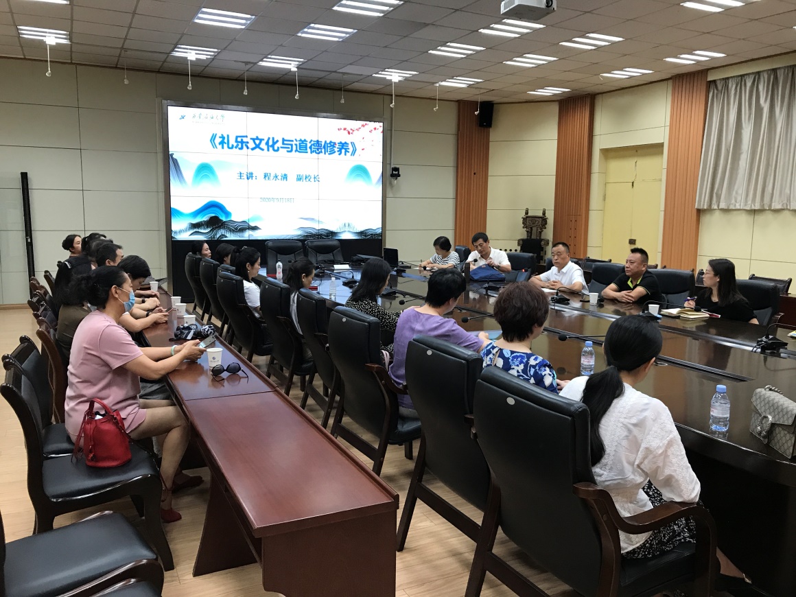 會上,副校長程永清作了題為《禮樂文化與道德修養》的專題講座。程校長分別從禮樂文化的內涵、禮樂的作用和重要的意義以及道德的概念和提高修養的方法和途徑等方面對禮樂文化、禮樂與道德之間的關系進行了深刻詳細的解讀。程校長提出:一方面要加強學習,把學習作為一種追求、愛好和健康的生活方式,做到好學樂學;另一方面要以革新的姿態、發展的眼光,及時更新知識儲備,積極關注社會現實,真正做到與時俱進。