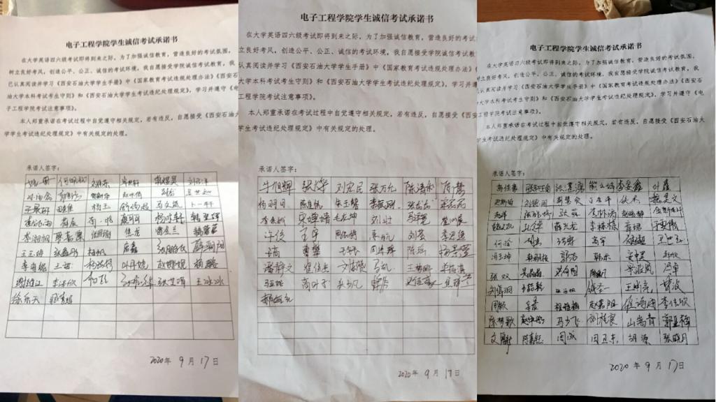 9月3日至4日學院分年級召開了誠信考試主題會議,向學生普及宣傳《國家教育考試違規處理辦法》、《西安石油大學考試違紀處分實施細則》等規章制度中有關組織作弊、替考、考試作弊等違紀處分相關政策規定,讓學生們深刻認識到違反校規校紀對自身發展的影響。在此基礎上結合現實事例向學生們講述誠信做人的重要性以及失信的危害,引導學生們要做誠實守信的人。