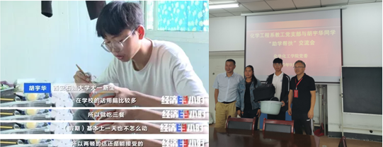 胡宇華來自貴州省畢節市大方縣,是我院2020級化學工程與工藝專業新生,他刻苦努力,自強不息的求學之路,經央視財經頻道《經濟半小時》欄目報道后,得到社會各界的廣泛關注。學校通過媒體立即聯系學生本人,并啟動相關資助程序;校領導在學生處的各位領導的陪同下也在報名當天看望了胡宇華同學及其母親,并為其送去了免費被褥用品領取券,減輕了生活上的負擔。學院黨委了解到情況后,及時與胡宇華同學取得聯系,安排輔導員專門與學生具體溝通并給給予相關幫助。同時,榮獲了“陜西省2020年高等教育師德建設示范團隊”稱號的化學工程系黨支部主動匯報學院黨委,擬啟動支部與胡宇華同學的對口“助學幫扶”活動,希望通過化工系教工黨支部的力量,給予該同學大學四年期間學業生活持續幫扶,使其在學業上能取得更大的成就,以此來回報父母、回報社會。