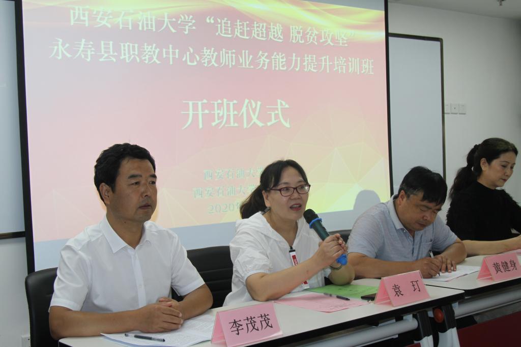 開班儀式上,袁玎主席做了熱情洋溢的致辭。她代表校工會歡迎各位學員的到來,并給學員們介紹了西安石油大學了歷史沿革和目前辦學規模和特色,希望學員們今后能關心支持學校的發展。黃健身副主任代表永壽縣教育局致答謝辭,他回顧了脫貧攻堅以來,西安石油大學為永壽社會經濟發展所辦的實事好事,并要求全體學員珍惜這次培訓的機會,認真參加培訓,確保這次培訓取得實效。最后,永壽縣職教中心副校長李茂茂,向承擔這次培訓任務的西安石油大學培訓中心贈送了一面題為“培育師資促發展、真心幫扶助攻堅”的錦旗。