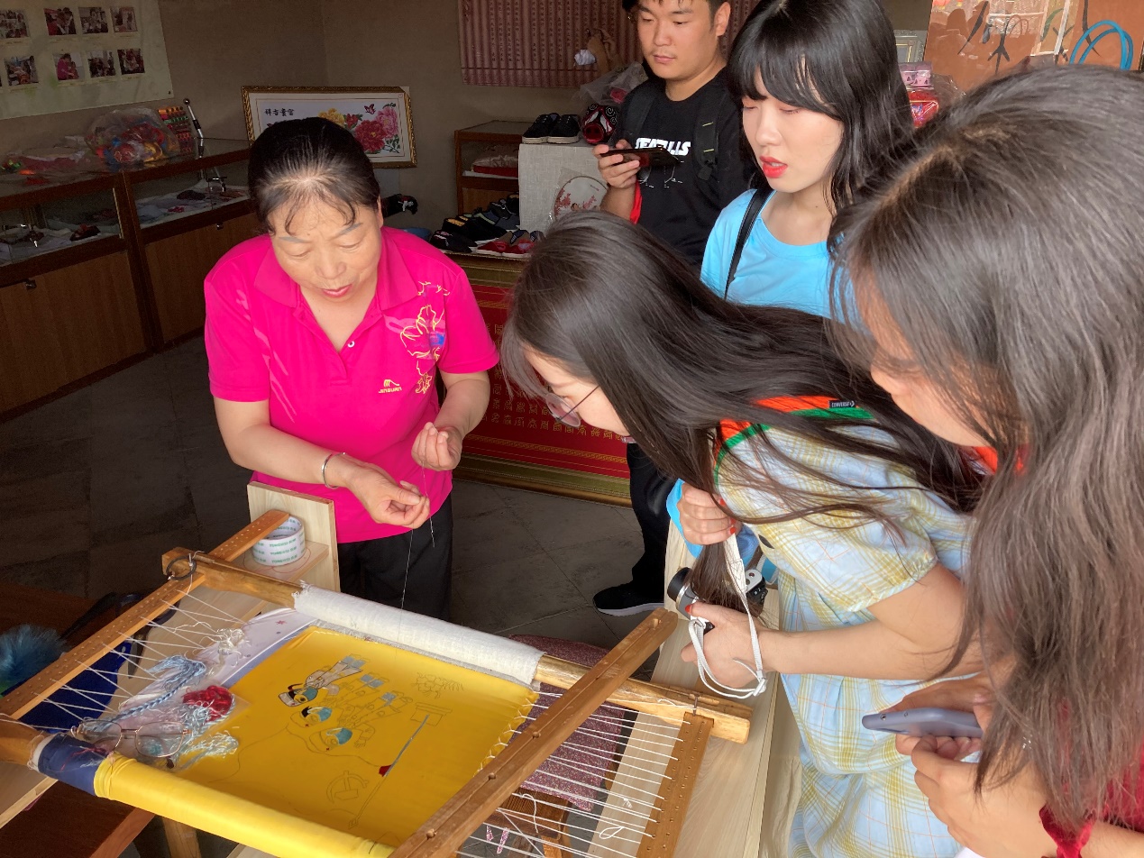8月1日,團隊于早上九點到達第一個調研地點秦人部落。木樁圍成的一塊與城市相隔的地方,旌旗飄飄,古樸的建筑讓人仿佛穿越到了古代。伴著古典的背景音樂,我們飽覽了秦人軍隊的雄風,走過長長的民俗街道,當地的美食與秦人手工藝品吸引著我們的眼球。其中最讓人記憶深刻的便是姜女秦秀。在這之前,我們只聽聞過蜀繡,蘇繡。今天才了解到秦秀,一個與孟姜女有關的傳統繡法。秦秀的特點顯著,例層次多、立體感強:秦繡不同于傳統刺繡的長針摻線,它是在真絲紗絡上用真絲線依照經緯網眼施針,一孔一針或幾孔一針。由于針的走向不同,使圖案花紋,畫面變幻多端,花中套花。針法的不同還使得繡線產生不同反光,同一色線形成不同的色彩效果,彰顯出真絲線材質的繽紛美感。秦繡作品中,小花紋的微妙變化與大塊面色彩經常對比運用,此時畫面生出層次和立體感,增加了整幅繡品格調的瑰麗典雅。