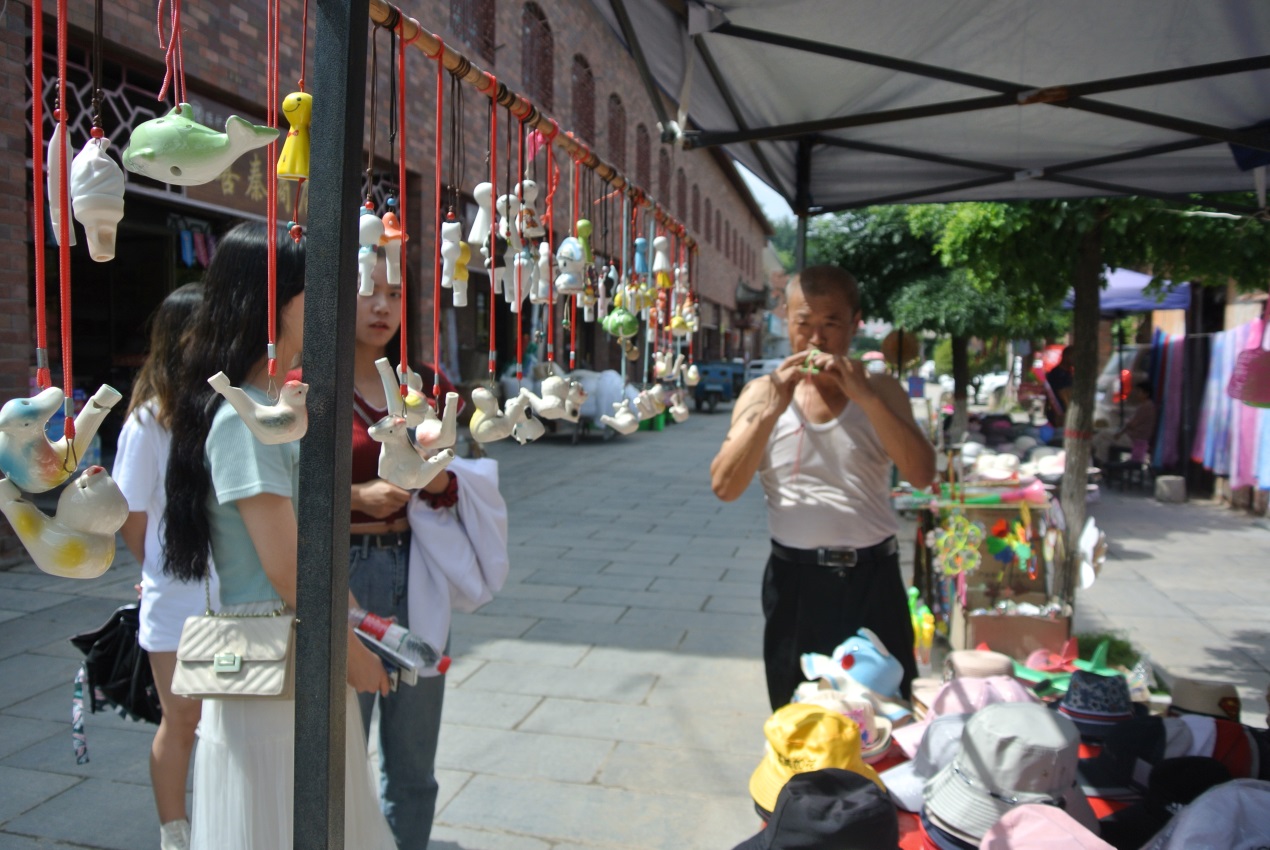 還有各式樣的陶瓷玩具,在販攤上最吸引游客的便是陶笛類的樂器。在一家攤販前,買陶塤的大叔還為我們現場表演了一番那件海豚形狀的陶器樂器。陶器不僅僅用于器具,觀賞性的擺件,在這里也被發掘為一種樂器,豐富的形式讓這件工藝品更具價值。不由得讓人心動購買它。在鎮子里還可以親手制作陶器,親身感受陶文化的魅力。這里不需要解說,那些肉眼可見的陶器,指尖觸碰到的古鎮,都訴說著這個古鎮的點點滴滴。