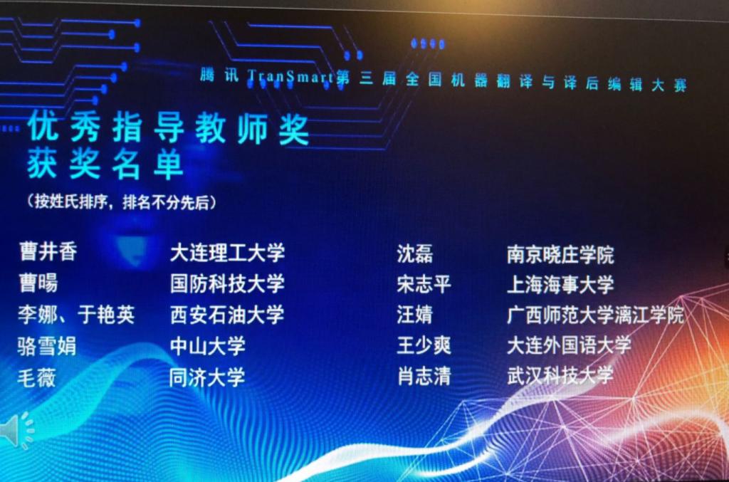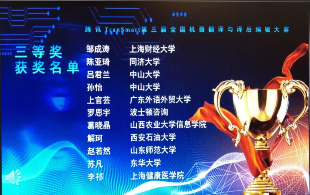 “騰訊TranSmart第三屆全國機器翻譯與譯后編輯大賽”的復賽于2020年7月4日在Tmxmall的官網平臺舉行,共有來自全國37多所高校超過4200名選手參賽。外國語學院于艷英、李娜老師獲得優秀指導教師獎,同時2018級翻譯碩士研究生解珂同學獲得三等獎的好成績。