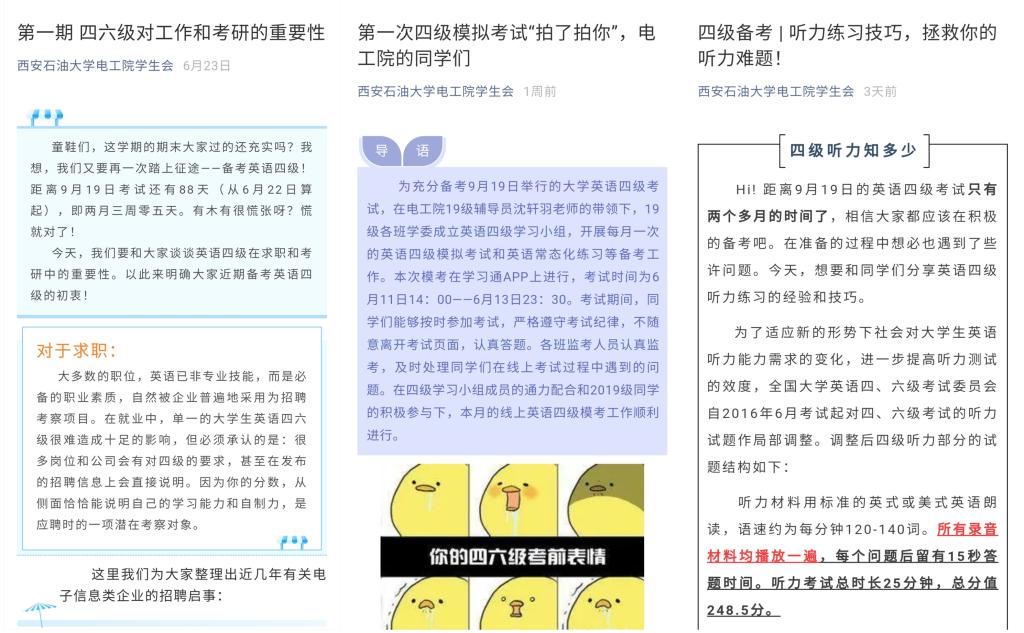 推送工作的主要工作內容為定期在學院微信公眾號和易班撰寫并推送四級備考相關的主題推送文。英語四級學習小組已在6月通過電子工程學院微信公眾號平臺和易班平臺推送四級的重要性、聽力題型分析及技巧和六月份??记闆r三篇文章。推送的意義在于與同學們分享四級備考經驗技巧,共同努力,共同進步幫助大家度過備考期。