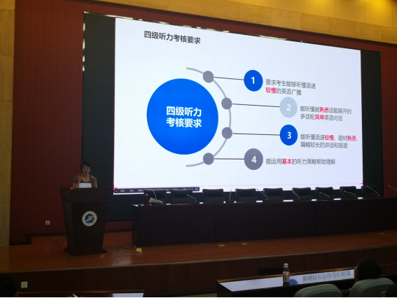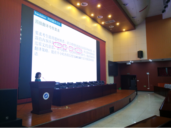 五場四級講座由外國語學院大學英語四級教學研究團隊教師主講,分別為武絨老師主講的“大學英語四級考試備考策略”、拓葳老師主講的“大學英語四級聽力專題”,周亮老師主講的“CET-4考試寫作題型分析及破題思路”,蔡利老師主講的“大學英語四級考試選詞填空及長篇閱讀答題技巧”及沈舒方老師主講的“大學英語四級翻譯專項”。主講教師就詞匯記憶、四級聽力與寫作的試題特點與應試策略、四級閱讀的出題特點與應試技巧及四級翻譯的命題特點和答題技巧進行了全面而又細致的講解。