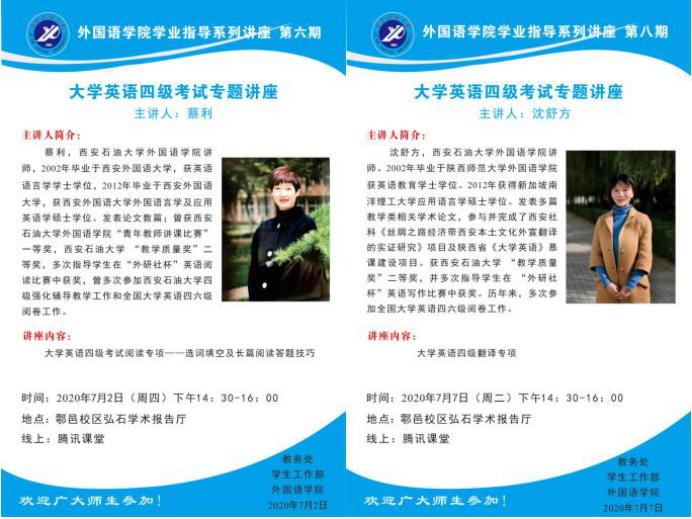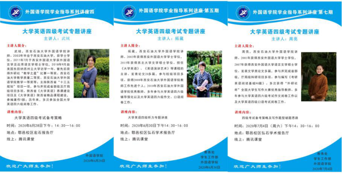 為了讓我校學生全面了解大學英語四級考試,提升大學英語四級通過率,在教務處和學生工作部的支持下,外國語學院于6月29日至7月7日分別舉辦五場大學英語四級講座。此次講座面向全校學生,以線上和線下兩種方式進行,線下主會場設在鄠邑校區弘石學術報告廳,分會場設在各四級強化輔導班教室,線上使用騰訊課堂直播,截至目前為止我校共有5342名同學通過線上線下方式參加了此次系列講座。