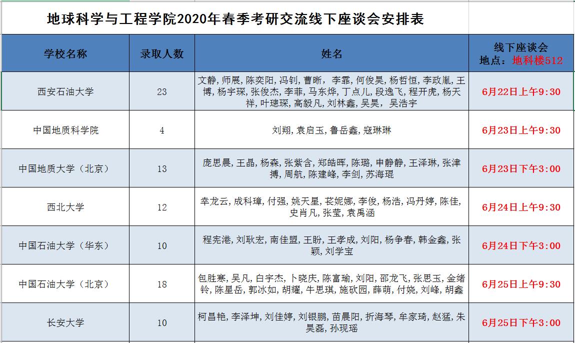 2020年6月22日——25日,地球科學與工程學院針對2017級考研學生,分西安石油大學、中國地質科學院、中國地質大學(北京)、西北大學、中國石油大學(華東)、中國石油大學(北京)、長安大學等七所目標院校,邀請2016級考研成功的同學分享經驗,一共舉辦七場考研交流活動。