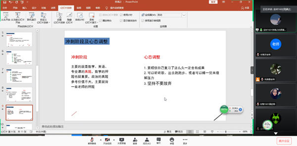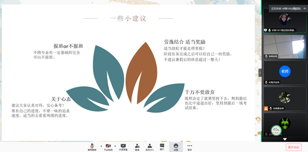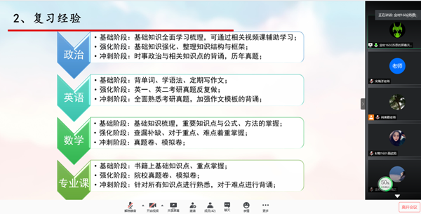接著,考研優秀學生代表聶欣茹、蘇恩和賀靖之三位同學為大家做了考研經驗交流。他們通過分享自己在考研院校與專業選擇、初試備考經歷、考研心態調整、復試備考及注意事項等方面的心得和經驗,為材料物理1701班學生考研備戰提供了很好的借鑒和幫助。