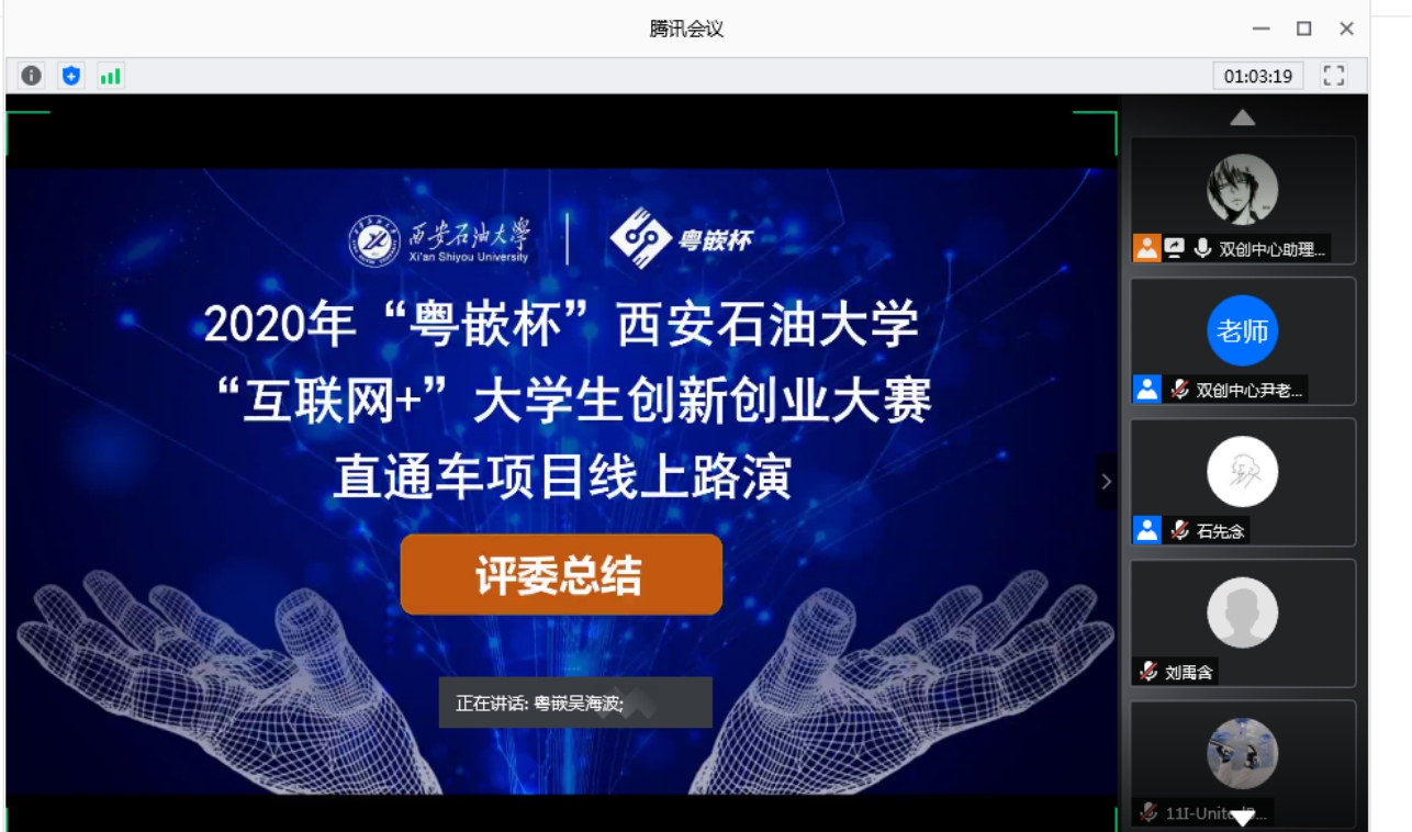 2020年6月12日—6月13日,創新創業中心組織了2020年“粵嵌杯”西安石油大學“互聯網+”大學生創新創業大賽直通車項目線上路演活動,此次路演通過騰訊會議分三場次進行,邀請廣州粵嵌眾創空間雙創導師吳海波、朱劍平、劉宇鵬擔任評委,創新創業中心主任賈莉娜老師為本次活動致辭,“直通車項目”團隊成員、指導老師、院系雙創工作聯絡員及創新創業中心工作人員參加了路演。