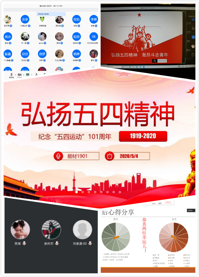 為紀念五四運動101周年,進一步引導廣大青年團員繼承和發揚五四精神,展現當代青年風采。2020年5月,材料科學與工程學院各班、團支部召開了以“傳承五四精神,弘揚愛國情懷”、“青春向黨、歌頌五四”等為主題的線上班團會。此次主題班團會準備充分,內容充實,形式多樣。通過線上學習習近平總書記五四寄語和優秀青年事跡、唱團歌、經典誦讀、知識競答、觀看五四精神紀錄片等方式,號召廣大團員不忘入團初心、牢記團員使命,以實際行動傳承五四精神、弘揚愛國情懷。