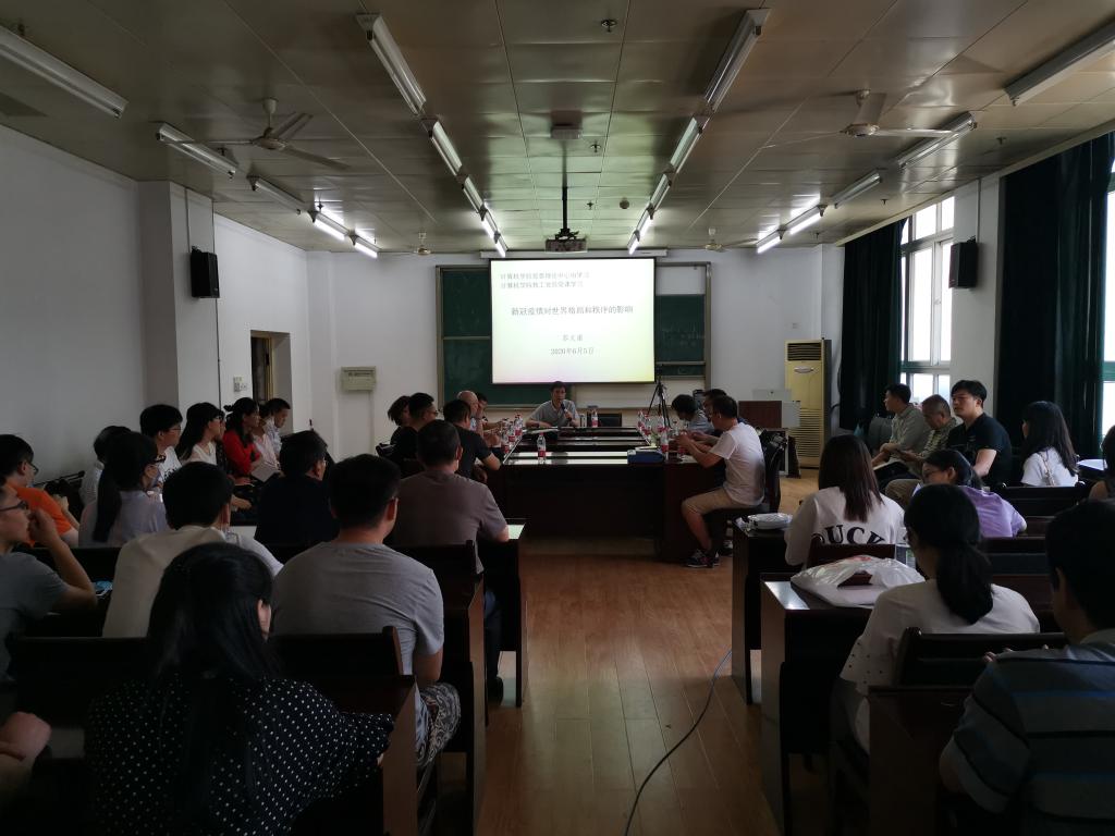 6月5日上午,副校長蘇文甫以《新冠疫情對世界格局和秩序的影響》為題,在雁塔校區2教402室為計算機學院全體教工黨員講授專題黨課。計算機學院黨委書記蔡建文主持本次黨課學習。