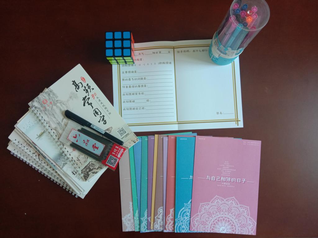 “獨處時光·有愛相伴六件套”是油緣心理老師特意為學生挑選的6種減壓益智的小工具,包括:察覺自我的心情日志手卡、礪心練腦的魔方、安心靜心的字帖、強身健體的呼啦圈、見證成長的種子罐頭、專業陪伴的心理援助平臺?!芭c自己相伴的日子”心情日志手卡,由學生心理成長指導中心策劃,人文學院文創中心精心設計,以含有西安石油大學元素的14種顏色的14個曼陀羅手卡代表隔離的14天,讓學生每天覺察自己的情緒、書寫自己的心聲、涂鴉自己的潛意識。在曼陀羅手卡的背景上,貼心送上油緣心理小建議,幫助學生在特殊的時期里好好愛自己。