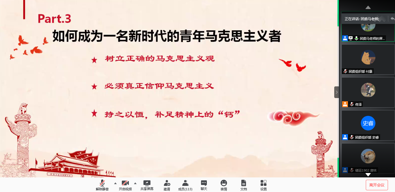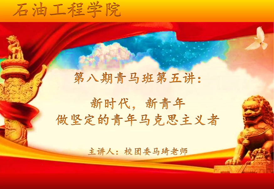 為進一步提升青年學生的理論修養,強化理想信念,5月29日下午石油工程學院第八期初級青馬班第五講順利開展。校團委馬琦老師受邀為全體參訓學員講授了題為“新時代,新青年,做堅定的青年馬克思主義者”的線上培訓,我院2019級120余名學生干部參加了此次培訓活動。