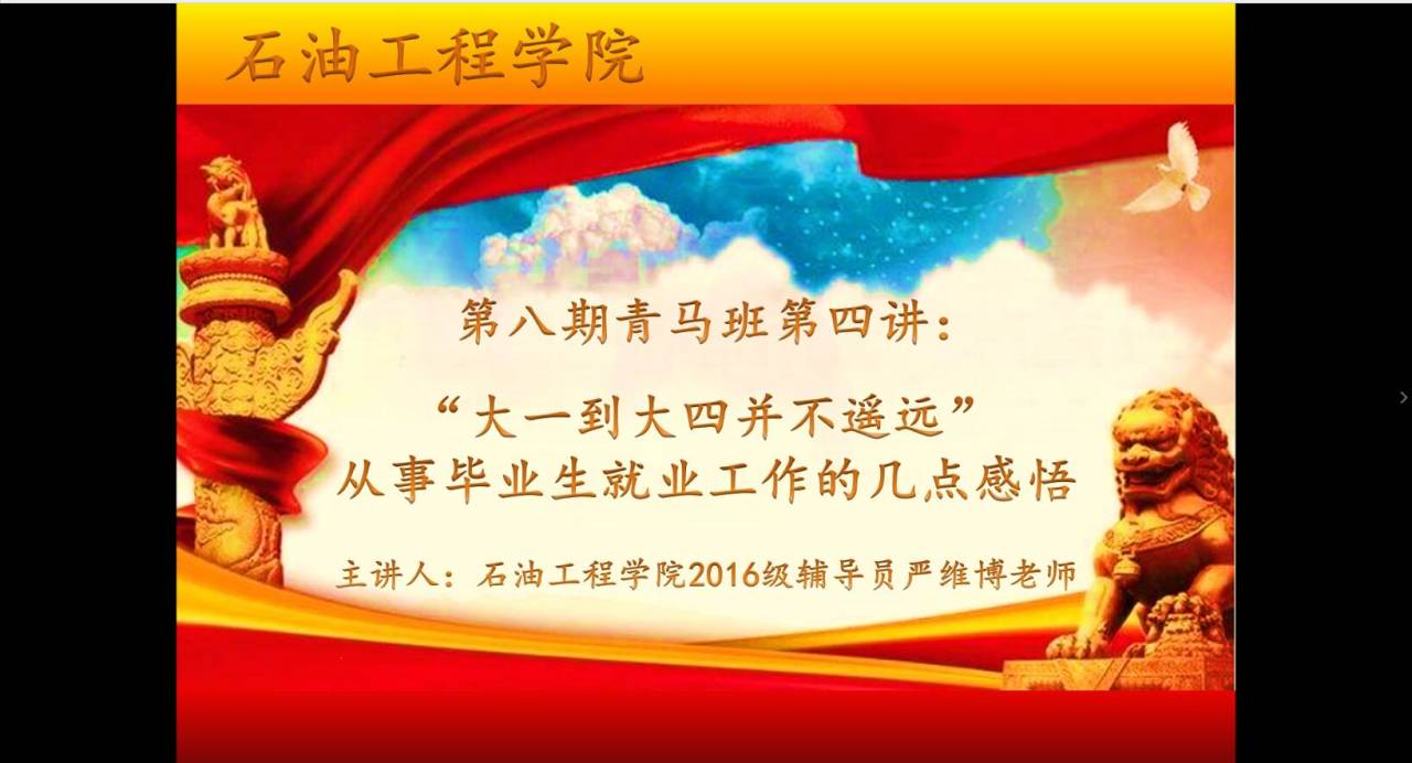 為提升學生干部在學習和工作中的統籌規劃能力,5月25日晚,石油工程學院第八期初級青馬班第四講如期在騰訊會議的線上平臺順利開展。我院2016級輔導員嚴維博老師為大家作了題為“大一到大四并不遙遠”的主題培訓,并與同學們分享了從事畢業生就業工作的幾點感悟,2019級120余名學生干部參加了此次培訓活動。