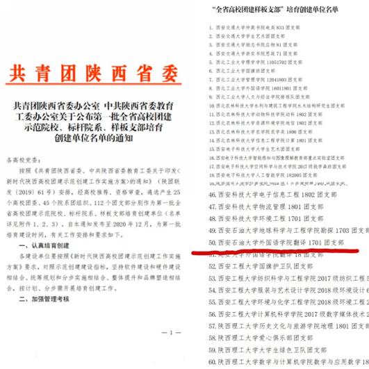 此次共青團陜西省委、中共陜西省委教育工委共遴選出25個高校團委、45個院系團組織、112個團支部分別作為第一批全省高校團建示范院校、標桿院系、樣板支部培育創建單位,外國語學院翻譯1701團支部位列其中。