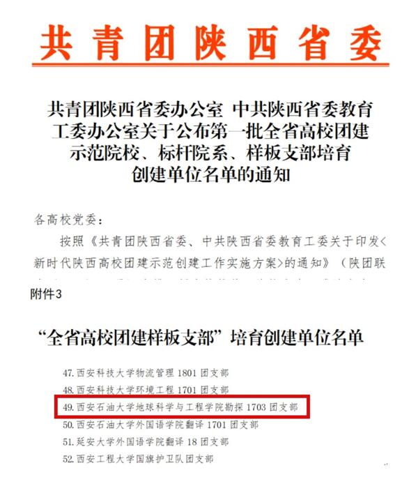 近日,經校團委推薦,共青團陜西省委辦公室、中共陜西省委教育工委辦公室聯合公布了“第一批全省高校示范院校、標桿院系、樣板支部培育創建單位名單”。地球科學與工程學院勘探1703團支部獲批“陜西省高校團建樣板團支部”培育創建單位。